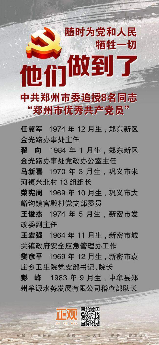 同样的,在此次被表彰的共产党员中,郑州人民不会忘记他们的名字——在解救米北村受困群众过程中被卷入洪水中牺牲的巩义市米河镇米北村13组原组长马新喜;在排查险情时遭遇山体滑坡牺牲的巩义市大峪沟镇官殿村原党支部委员荣宪周;在防汛抢险返回途中被洪水冲走牺牲的新密市发展和改革委原党组成员、副主任王俊杰;在辖区各村卫生所查看防汛安全时突遭山洪牺牲的新密市袁庄乡卫生院原党支部书记、院长樊彦平;在防汛救灾中,跳入塌方处、关闭供水阀门时,体力不支牺牲的中牟县郑州牟源水务发展有限公司原稽查部队长彭峰。