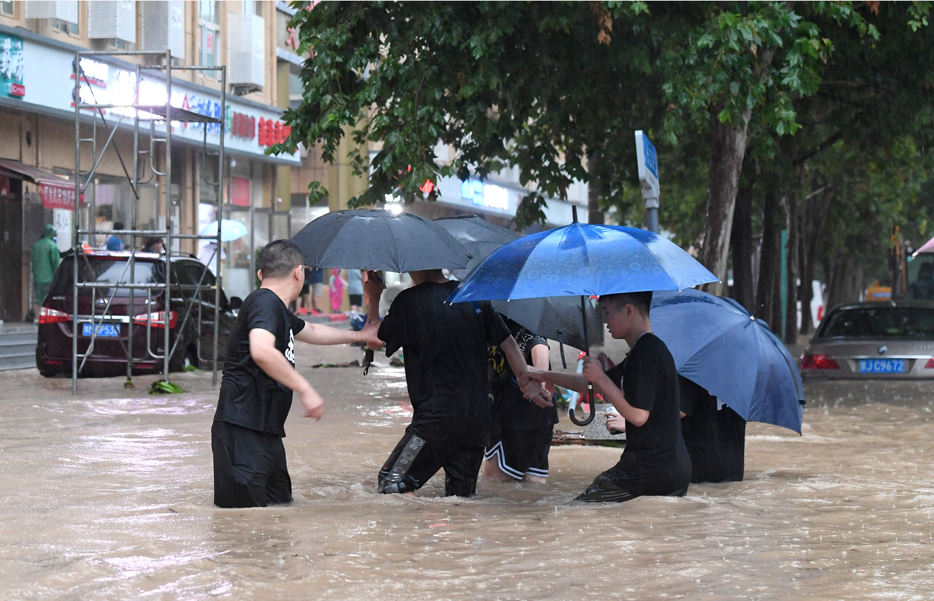 2021年7月20日下午6时,长江路爱心路口,一名党员热心地帮助行人通过深深的积水。