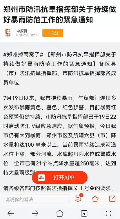 上午9时许,中原网、看郑州客户端发布《郑州市防汛抗旱指挥部关于持续做好暴雨防范工作的紧急通知》,提醒市民暴雨期间减少出行,避让积水路段,远离河道和危险山区;全市不涉及城市运营的机关、企(事)业单位采取弹性上班方式或错峰上下班。