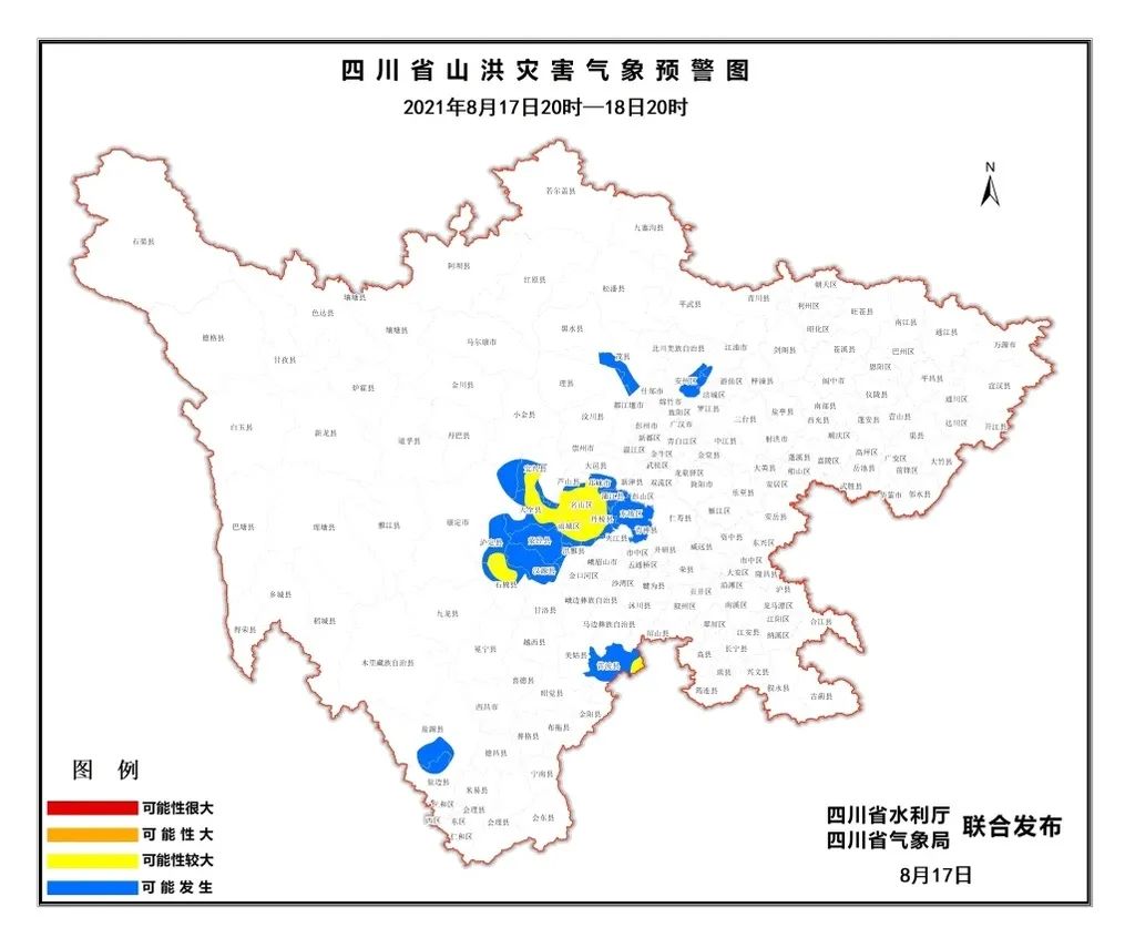 8月17日18时,四川省水利厅、四川省气象局联合发布山洪灾害黄色预警。8月17日20时至18日20时,泸定、雨城、石棉、名山、芦山、天全、宝兴、雷波、丹棱、邛崃、蒲江等县(市、区)发生山洪灾害可能性较大;汶川、理县、茂县、安州、北川、康定、东坡、洪雅、青神、盐源、盐边等县(市、区)可能发生山洪灾害。
