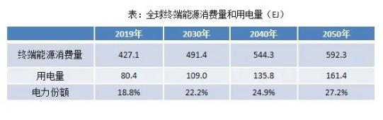 从下表中可以看出,从2019年到2050年全球用电量虽然逐年上升,但在终端能源消费总量中最高为27.2%,其它均为非电力消费。