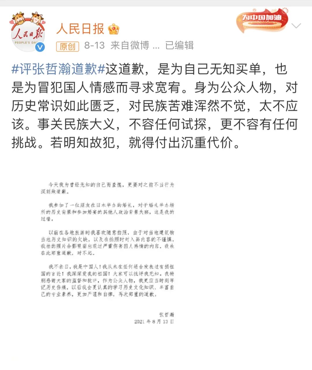 2021年8月13日,“顶流小生”张哲瀚为自己在乃木神社参加友人婚礼和在靖国神社前微笑留影的“无知行为”发表公开道歉,人民日报官方微博对张哲瀚事件发表评论:事关民族大义,不容任何试探,更不容任何挑战。若明知故犯,就得付出沉重的代价!