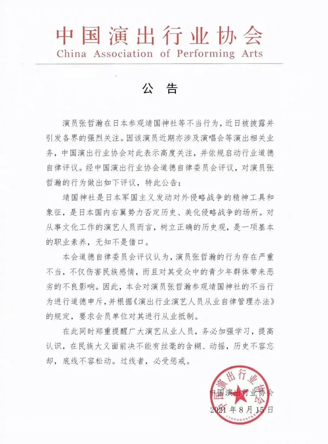 随后,中国演出行业协会对演员张哲瀚参观靖国神社的不当行为进行道德申斥,并根据《演出行业演艺人员从业自律管理办法》的规定,要求会员单位对其进行从业抵制。