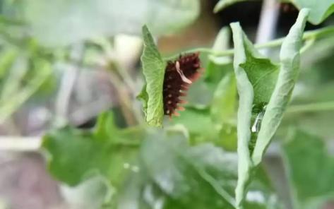 叶片上已经出现十多只红珠凤蝶的不同阶段的幼虫