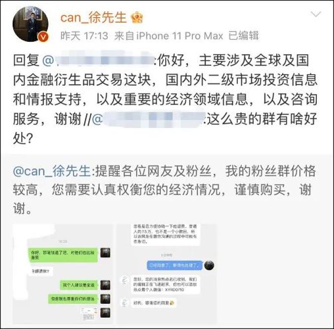 徐勤根还曾发帖提醒,称粉丝群价格较高,大家需要认真权衡自己的经济情况、谨慎购买。