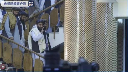 正当大家都在焦躁不安地等待时,穆贾希德从主席台左侧走下楼梯,被一群没有携带武器的塔利班成员簇拥着,脸上带着一丝微笑,坐在了原本属于梅纳帕尔的位置上。