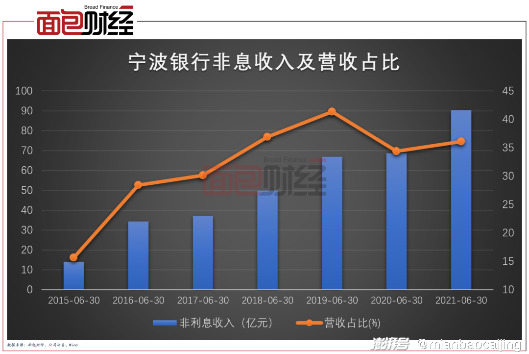 2021上半年,该行实现非利息收入90.36亿元,较上年同期增加21.66亿元,增幅为31.53%。其在营收中的占比也由2015年中期的15.65%提升至2021年中期的36.12%。