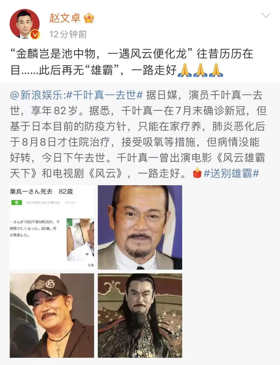千叶真一当地时间19日17时26分因新冠肺炎在千叶县君津市的医院去世。其所在事务所当天晚些时候公布了这个消息。