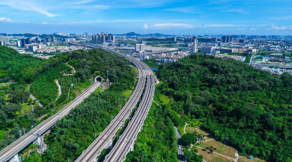 公园的最大的特点是有多条高铁轨道穿过山体,高铁轨道被郁郁葱葱的植物环抱着,往来的高铁疾速飞驰,风景别具一格。