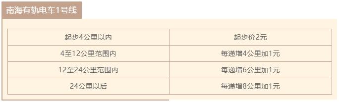 按里程分段计价,与广佛地铁线网基本票价保持一致。起步价格4公里以内2元;4至12公里范围内每递增4公里加1元;12至24公里范围内每递增6公里加1元;24公里以后,每递增8公里加1元。