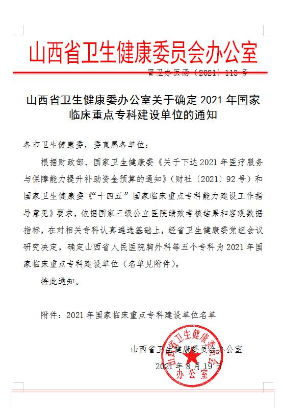 本次评定,是根据财政部、国家卫健委《关于下达2021年医疗服务与保障能力提升补助资金预算的通知》(财社 [2021] 92号)和国家卫健委《“十四五”国家临床重点专科能力建设工作指导意见》要求,依据国家三级公立医院绩效考核结果和客观数据指标,在对相关专科认真遴选基础上,经省卫健委党组会议研究决定:临汾市人民医院胸外科、山西省人民医院胸外科、山西医科大学第一医院产科、山西省儿童医院小儿外科、运城市中心医院心血管内科被确定为我省2021年国家临床重点专科建设单位。