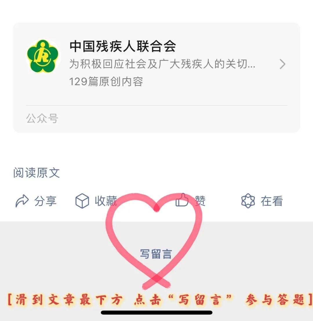 • 8月20日至24日,中国残联微信公众号发布有奖竞答活动,请您采用“写留言”的方式回复答案(留言中包含答题和加油鼓劲短句)。