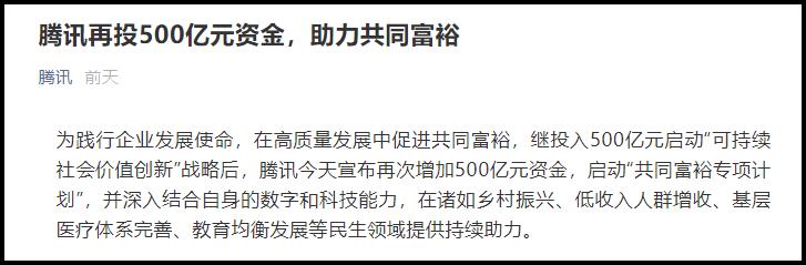 8月18日,腾讯公司宣布再次增加500亿元资金,启动“共同富裕专项计划”。