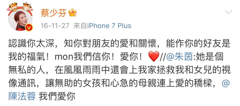 1993年,蔡少芬和洪欣一起出演了电视剧《魔刀侠情》,相似的感情纠葛和家庭背景,让两人惺惺相惜,迅速成为了好姐妹。