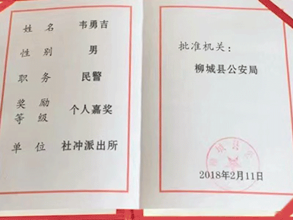 从警仅6年,韦勇吉同志先后在柳城县公安局太平派出所、社冲派出所、刑事侦查大队工作。韦勇吉同志对党忠诚、心系人民,以实际行动生动诠释了一名共产党员对党的事业的无限忠诚和对人民的无比热爱。韦勇吉同志曾主办区公安厅督办案件“2006年李某被杀案”和“2002年8.14爆炸案”等精品案例。因表现突出,曾荣获个人嘉奖二次,先进个人一次,年度公务员考核优秀一次。