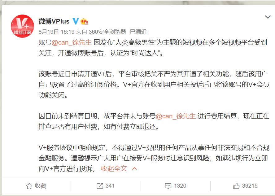 针对该微博用户这一行为,微博Vplus官方账号于8月20日发布回应称,账号@can_徐先生近日申请开通V+后,平台审核把关不严为其开通了相关功能,随后该用户自己设置了过高的订阅价格。V+官方在收到用户相关投诉后已将该账号的V+会员功能关闭。因目前未到结算日期,故平台并未与账号@can_徐先生进行费用结算,现在正在排查是否有用户付费,如有付费立即退还。