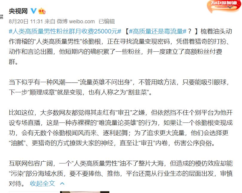 原标题:《“人类高质量男性”被禁言!粉丝群一月收2.5万,采访更要收25万》
