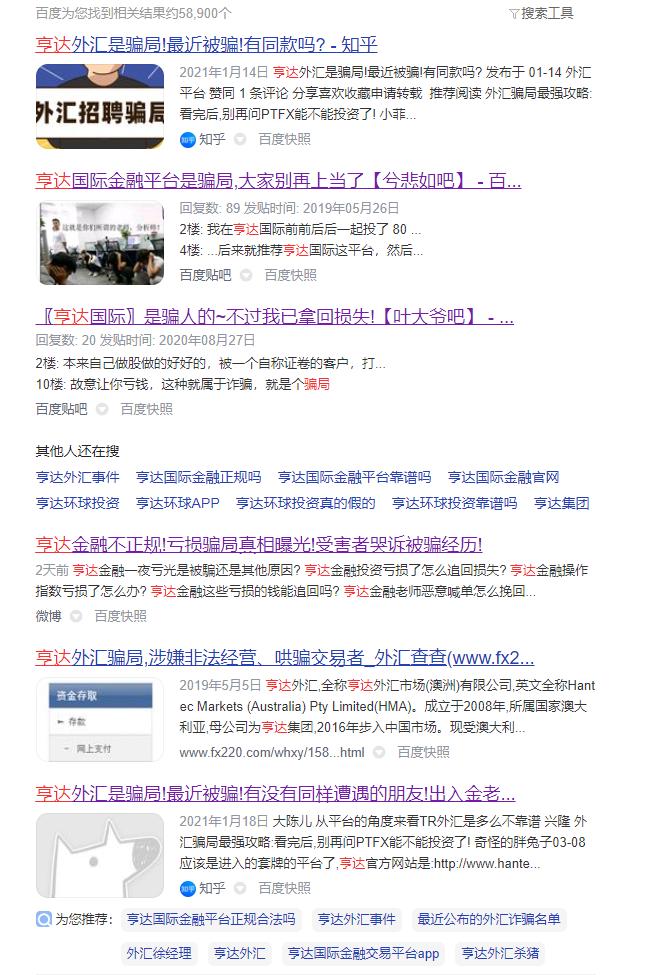 而百度一下,就可以查到不少人在亨达集团平台上被骗过钱。