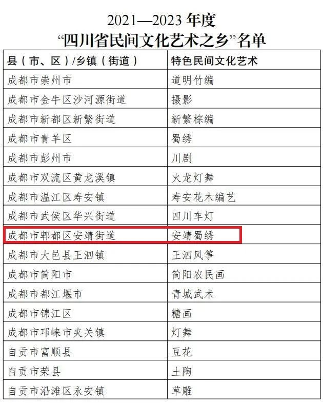 原标题:《四川公布120个民间文化艺术之乡,“蜀绣之乡”安靖榜上有名!》