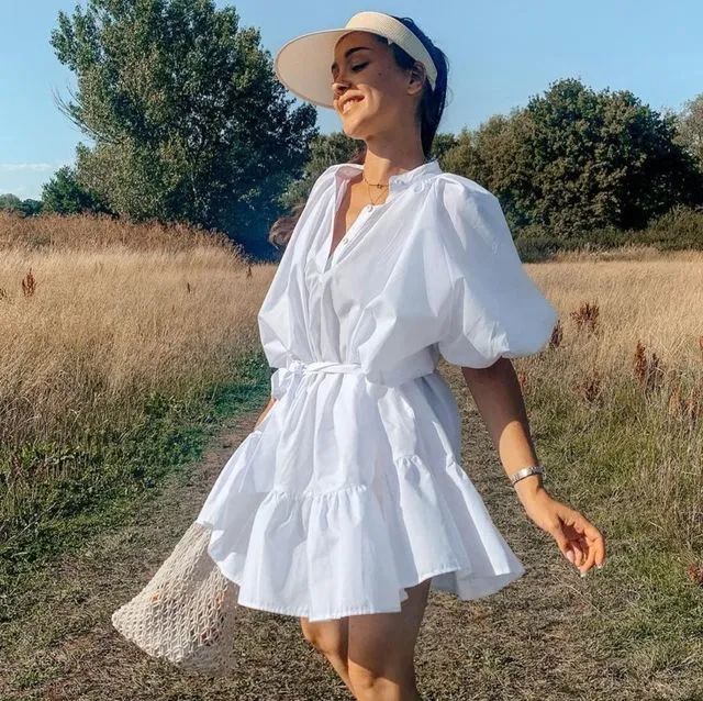 有比较贴近国内大众审美、适合白皮肤而且有肉的妹子的泡泡袖印花连衣裙: