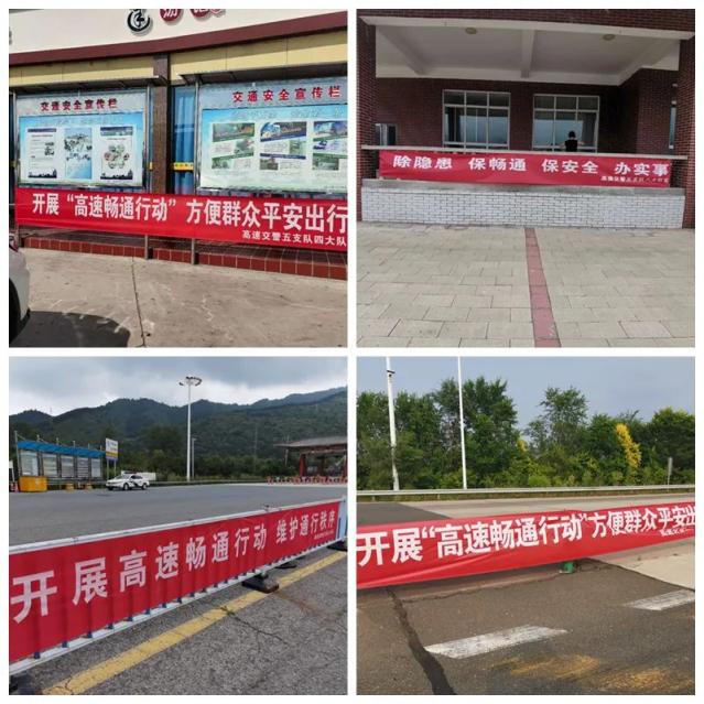 五支队及各大队在辖区各收费站、服务区悬挂条幅,同时在服务区或收费站通过讲解交通安全宣传知识、发放交通安全宣传折页及摆放宣传展板等形式,开展“高速畅通行动”宣传活动,并通过LED显示屏发送宣传语以及高速管制路况媒体发布群发送路况,营造“高速畅通行动”浓厚氛围。
