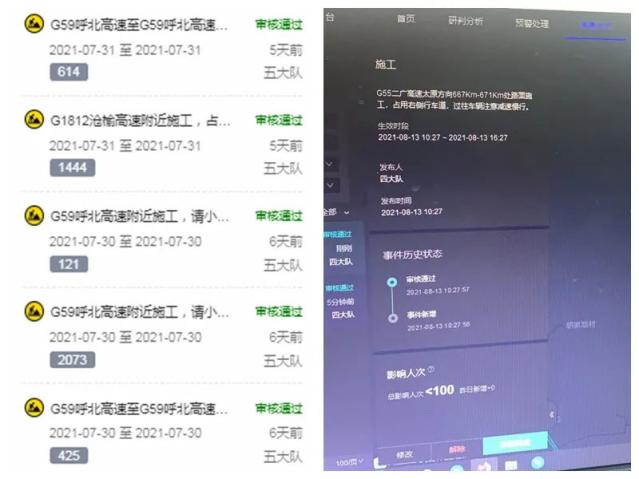 辖区遇到发生事故、车辆故障、路面施工导致拥堵或小气候恶劣天气进行交通管制时,第一时间推送相关联动成员单位,并利用高德地图交警客户端进行标注发布,通过支队微信、微博、相关大队LED显示屏及管制路况媒体发布群及时发布交通管制信息,提高路况信息发布的及时性、精准性和广泛性。