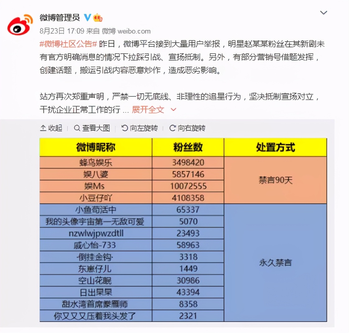 3.知名艺人粉丝群被大规模禁言:22日,艺人赵丽颖的粉丝在其新剧未有官方明确消息的情况下拉踩引战、恶意炒作,造成恶劣影响。23日,赵丽颖粉丝群的多个官方微博或大V遭新浪微博禁言。这也是今年6月中央网信办决定开展“清朗•‘饭圈’乱象整治专项行动”后,首个因“互撕”遭大规模禁言的粉丝群体。(都市快报)