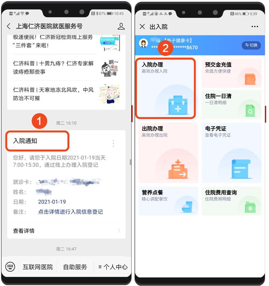 医生开具入院申请单后,入院当天手机端会收到一条“入院通知”的微信消息,点击消息,在提示时间内进行入院办理相关操作。