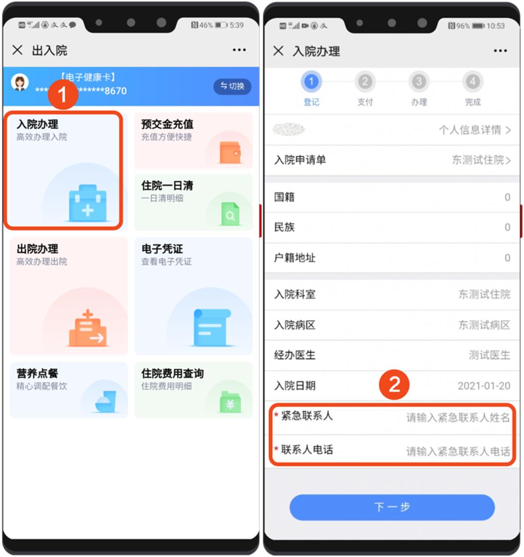 确认入院申请单信息,填写紧急联系人及电话,点击“下一步”。
