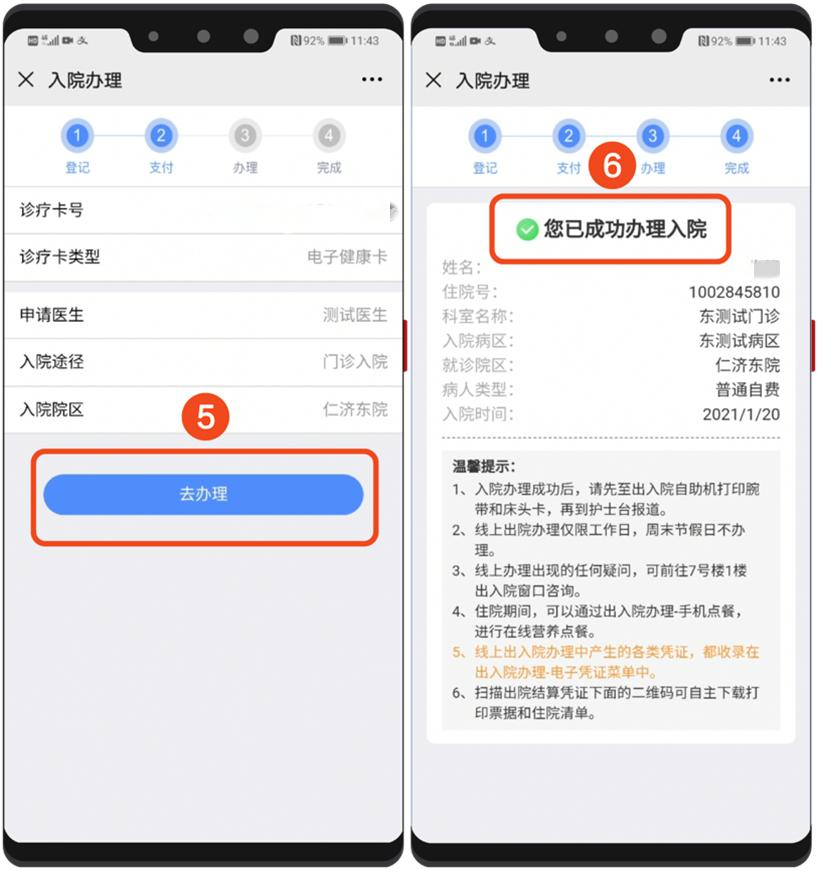 在东院区住院的患者在办理成功后,可自行到位于东院区7号楼1楼的出入院自助机打印腕带和床头卡,再到护士台报道。