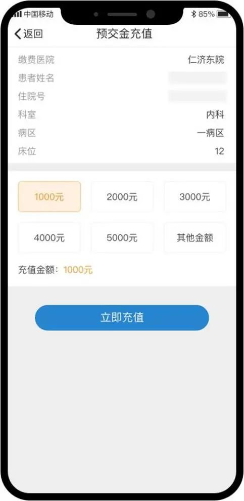预交金可以在线补缴,从公众号首页-自助服务-出入院办理-预交金充值,进行在线充值,就像手机交话费一样简单。
