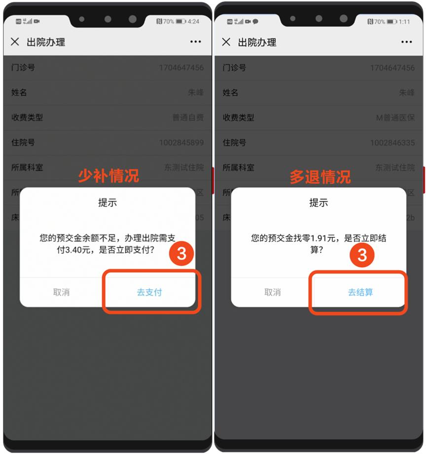 如系统提示补缴费用,请一次性在线补交费用,再进行出院办理;如预交金结算金额有剩余,系统会自动将多余资金退回原收款账户,具体到账时间以系统通知为准。