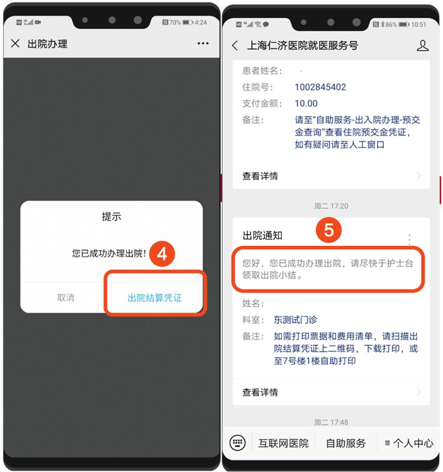 在护士台办理出院手续后,手机端会收到一条“出院通知”的微信提醒消息,点击消息,进行出院办理操作。也可以从公众号首页-自助服务-出入院办理-出院办理,主动查询办理。