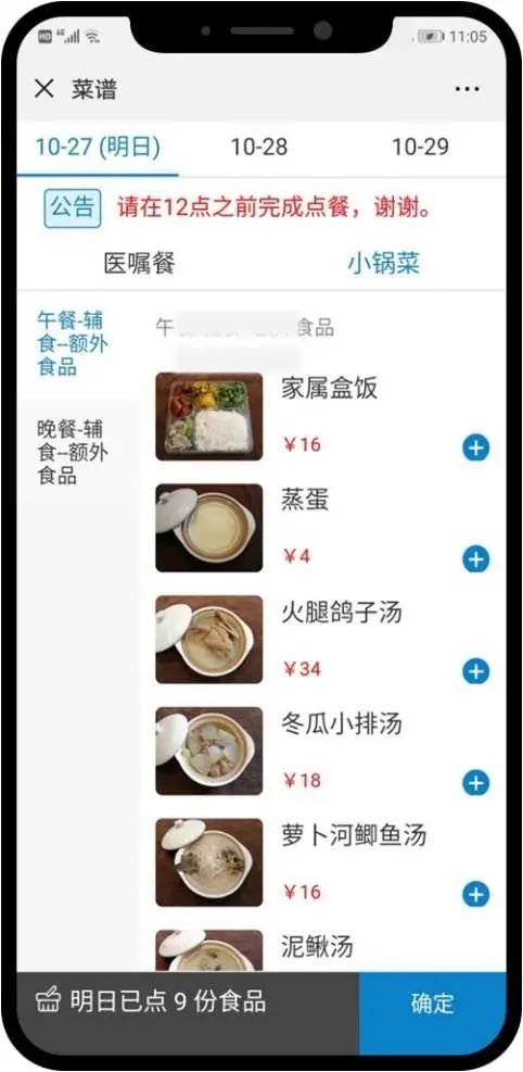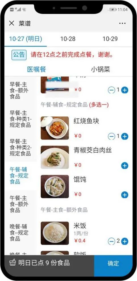 此外,住院期间,可以通过公众号首页-自助服务-出入院办理-营养点餐,进行在线点餐,菜品丰富,不仅提供住院病人医嘱餐,还提供家属盒饭的优惠餐福利。