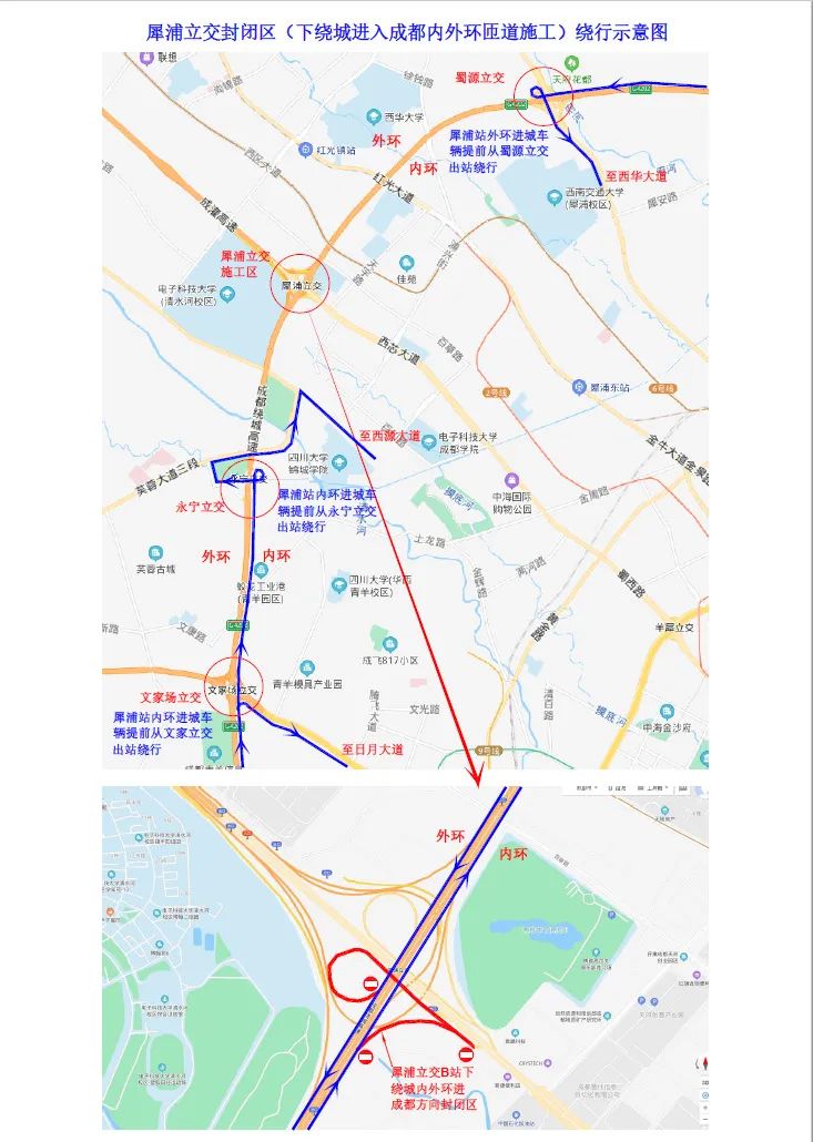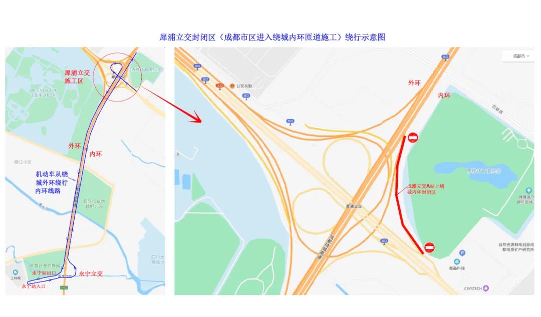 2021年9月1日至9月6日,每晚22:00至次日6:00,成都绕城高速(G4202)犀浦立交南向西右转进城和北向西进城匝道桥封闭施工,禁止机动车通行。
