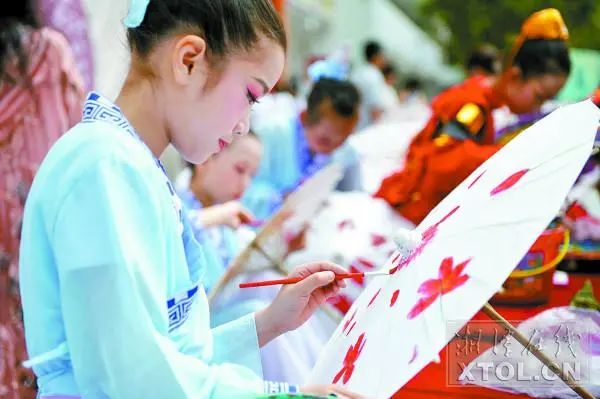 “双减负”让学生们有充足的时间发展自己的兴趣爱好。图为雨湖区风车坪学校学生在油纸伞上画画。(记者 欧阳天 摄)