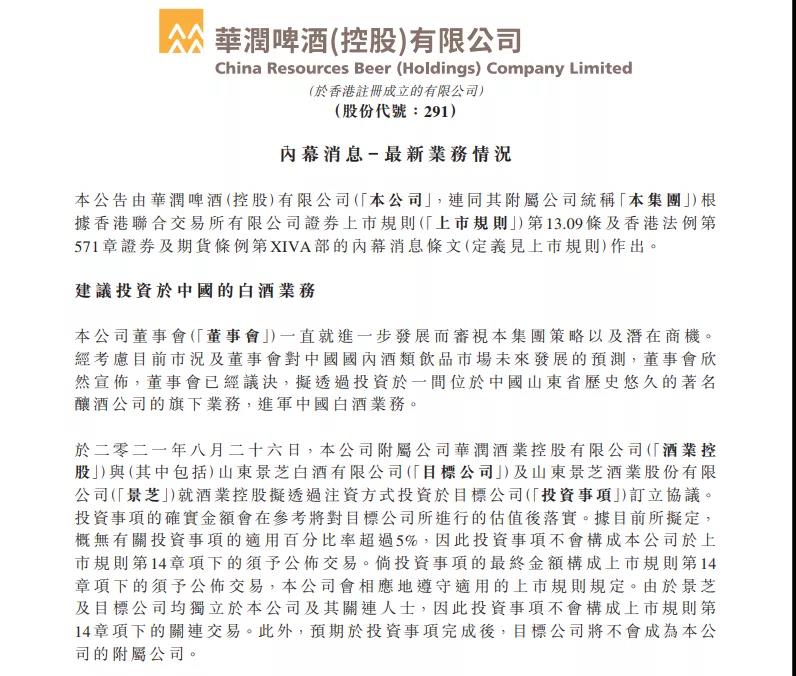 根据公告,华润啤酒方面称景芝白酒主要从事在中国酿造、分销及推广白酒的业务,在上述投资事项完成后,其将成为景芝酒业旗下唯一的白酒业务营运主体。