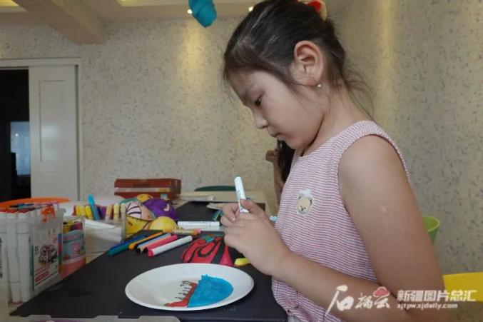 木妮孜热·斯拉吉丁画完脸谱,又开始画赛龙舟。石榴云/新疆日报记者赵敏摄