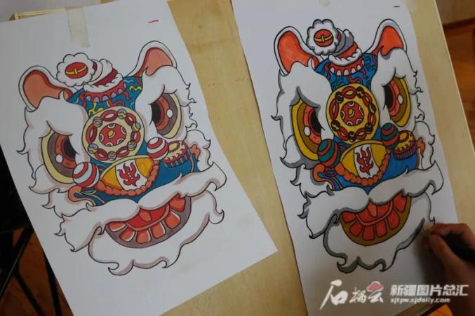 孩子们画的舞龙舞狮。石榴云/新疆日报记者赵敏摄
