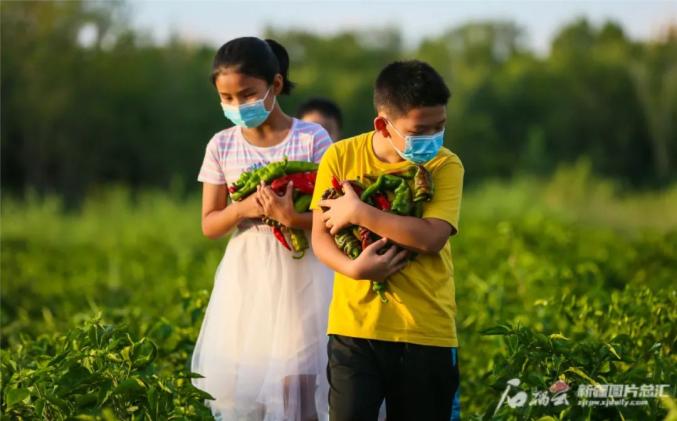 8月6日,在呼图壁县园户村镇和庄村,小朋友在采摘园里采摘蔬菜。暑假期间,很多家长带着孩子来到该采摘园,感受田园风光、体验采摘乐趣。马光元摄