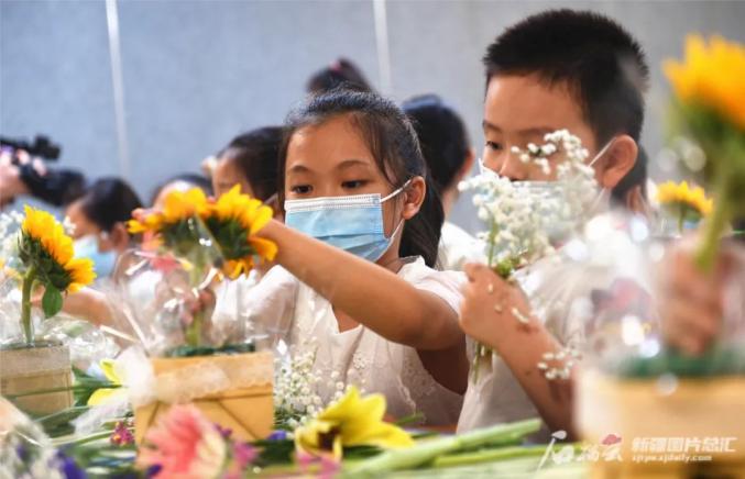 7月8日,学生在学习插花技艺。当日,乌鲁木齐市天山区青年路片区管委会举办“插花品香”公益活动,组织辖区学生体验插花艺术,丰富学生们的暑期生活。石榴云/新疆日报记者阿扎提·玉素甫江摄
