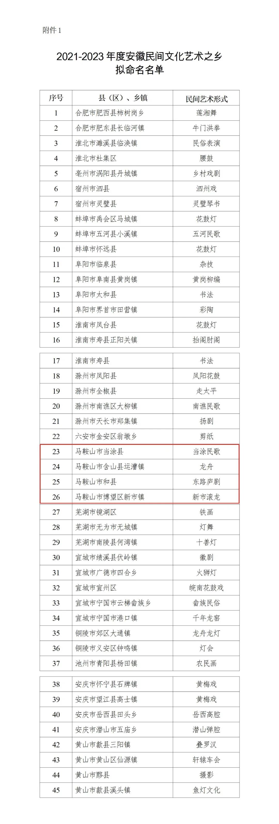 根据《安徽省文化和旅游厅关于开展2021-2023年度“安徽民间文化艺术之乡”评审命名工作的通知》(皖文旅秘〔2021〕53号)安排,4月以来,省文化和旅游厅在全省组织了2021-2023年度安徽民间文化艺术之乡申报工作。经各地填报、各市初审及公示、专家评审、厅会议审议,拟命名以下45个县(区)、乡镇为“2021-2023年度安徽民间文化艺术之乡”,推荐8个县(乡镇)申报“2021-2023年度中国民间文化艺术之乡”。现将名单予以公示,公示期为2021年8月24日至2021年8月30日(5个工作日)。
