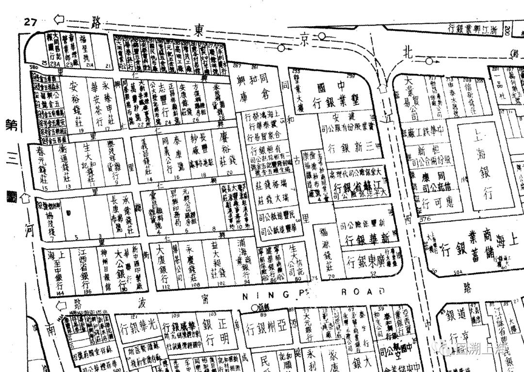 宁波路是上海钱庄的大本营,几十家较大的汇划庄如福源、五丰、永兴、永丰、安康等几乎全部设在这里。公议上海银洋辅币行市的钱行亦设在这条路上。此外,还有中实、永立等银号。大的本国银行有上海商业储蓄、广东、永亨等。