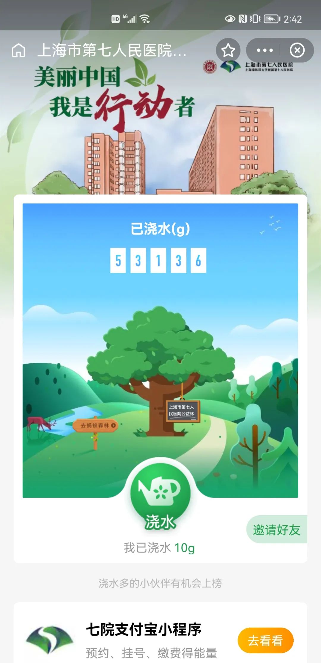现在,只要打开支付宝,搜索 “上海市第七人民医院公益林”,动动手指,就可以为上海市第七人民医院公益林浇水啦!