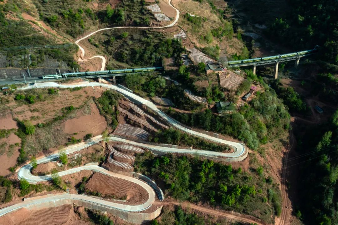 ▲ 图为即将抵达成昆铁路沙马拉达站的5634次列车和通站公路(4月11日摄,无人机照片)。