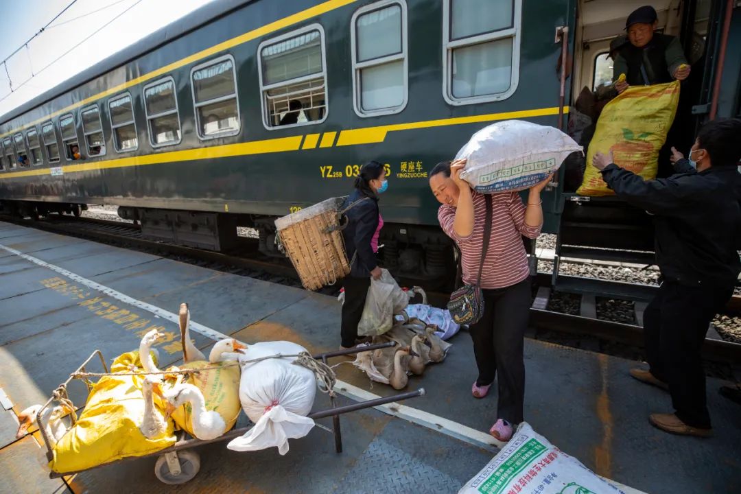 ▲ 5633次列车停靠车站后,彝族小商贩忙着把货卸下来(4月11日摄)。