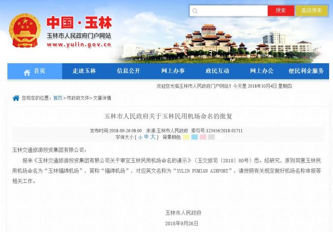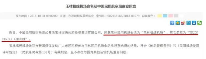 玉林福绵机场的命名获得玉林市人民政府批复。