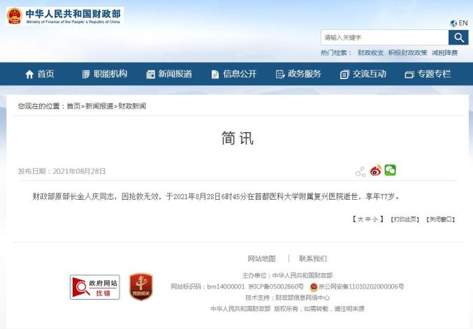 财政部网站消息,财政部原部长金人庆同志,因抢救无效,于2021年8月28日6时45分在首都医科大学附属复兴医院逝世,享年77岁。