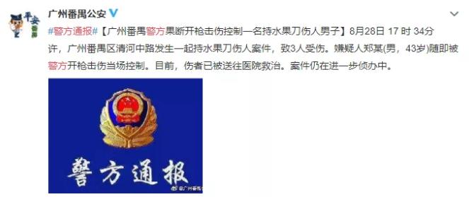 据广州番禺公安28日通报:8月28日 17 时 34分许,广州番禺区清河中路发生一起持水果刀伤人案件,致3人受伤。嫌疑人郑某(男,43岁)随即被警方开枪击伤当场控制。目前,伤者已被送往医院救治。案件仍在进一步侦办中。