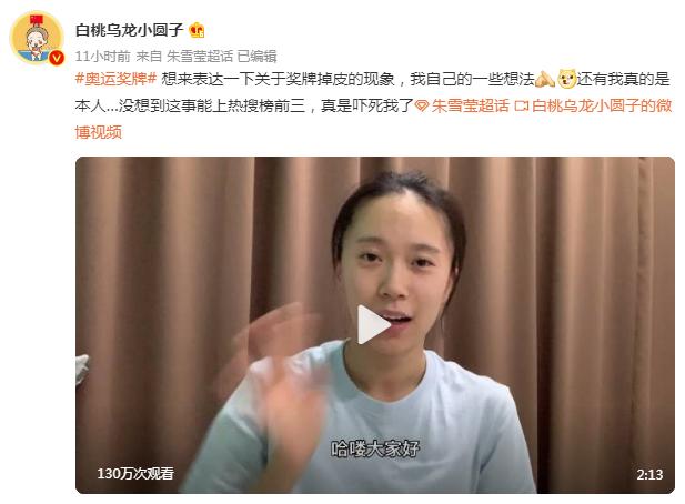 8月23日,朱雪莹在个人微博@白桃乌龙小圆子 中发文称自己的金牌目前已经掉了一大块皮,微博话题#朱雪莹的东京奥运会金牌掉一层皮#得到广泛关注。
